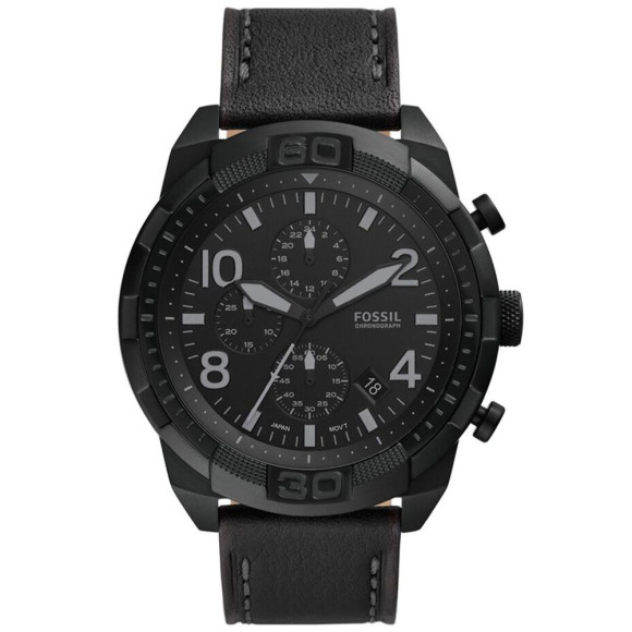 Introducing the Fossil® Chronograph 'Bronson' Men's Watch FS5874, a remarkable example of durability and style. This watch is designed for the modern man who appreciates both functionality and aesthetics. Built with a robust stainless steel case, this timepiece exudes toughness while showcasing an eye-catching black finish. Measuring 50mm in diameter, it commands attention on the wrist without being overbearing. The watch features a round case that is just 11mm thick, striking an ideal balance between substance and elegance. The stunning black dial, covered by durable mineral glass, offers a stunning contrast against the watch case and a clear view of its chronograph functionality. The watch allows you to keep track of time with precision thanks to its reliable quartz movement. You’ll appreciate its sporty design combined with a date calendar feature, making it practical for everyday wear. Accompanied by a rugged black leather band, measuring 21cm in length and 24mm in width, it ensures both comfort and style. With a secure buckle clasp, you can be confident that your watch will stay in place during any activity. The watch is engineered to withstand the pressures of daily life, with an impressive water resistance of up to 5 bars. Whether you're at the office or out for a weekend adventure, the Fossil Chronograph 'Bronson' is the perfect accessory for the discerning gentleman.Shop Fossil FS5874 at Ormoda