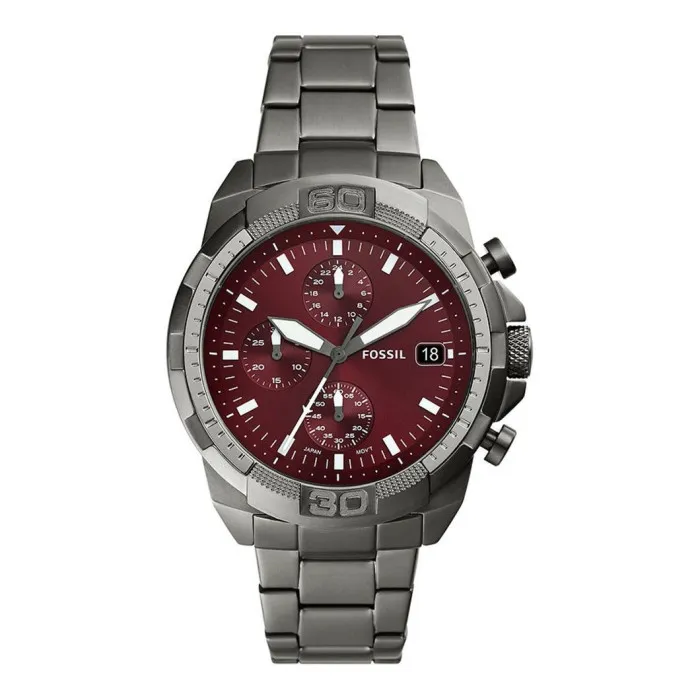 The Fossil® Chronograph 'Bronson' Men's Watch FS6017 is a stunning homage to modern masculinity and sophisticated style. This sporty timepiece boasts a robust 44mm round case crafted from durable stainless steel, ensuring that it withstands the rigors of everyday wear while maintaining an air of elegance. The striking burgundy dial houses luminous hands and numbers, making it easy to read even in low-light conditions. With a quartz movement driving its reliable performance, you'll never miss a beat, whether on the field or at the office. A standout feature of this watch is its chronograph functionality, perfect for the man who values utility alongside style. It doesn't just tell time; it allows for precise timekeeping with a stopwatch feature, enhancing your daily routines and adventures. You can also keep track of the date with ease, thanks to the integrated calendar. The sleek grey stainless steel band, measuring 22mm in width, is secured with a fold-over clasp that boasts a push-button release, providing both security and comfort. With a length of 21cm, it adapts well to various wrist sizes, making it an ideal gift for yourself or a significant male figure in your life. This watch is water-resistant up to 5 bars, allowing for leisure activities without the worry of damage. The total weight of 162 grams adds a reassuring heft, making it feel substantial on the wrist without being cumbersome. Whether at a casual gathering or a formal event, the Fossil® Chronograph 'Bronson' ensures you present yourself with confidence and style. Its gray tones and sporty design make it a versatile companion for any outfit, setting you apart in any crowd. Enhance your watch collection with this exquisite piece that blends function and fashion seamlessly.Shop Fossil FS6017 at Ormoda
