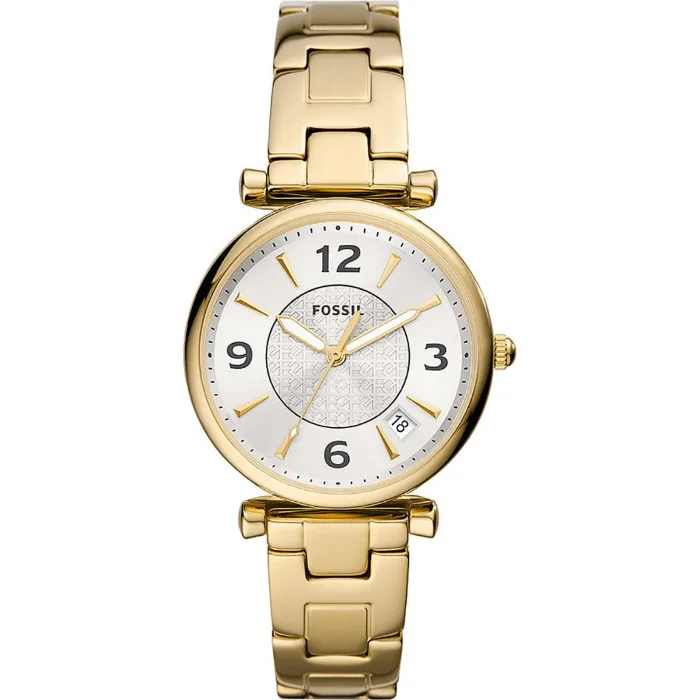 Introducing the Fossil® Analogue 'Carlie' Women's Watch ES5159, a delightful accessory designed for the sophisticated woman who revels in elegance. This exquisite timepiece marries classic charm with contemporary flair, making it a staple for both everyday wear and special occasions. Fossil is renowned for its commitment to quality and style, and the Carlie model exemplifies this with its stunning gold accents and intricate design. The gleaming stainless steel case and bracelet are not only a testament to durability but also add a luxurious touch that complements any outfit. At 35mm in diameter, the round case is perfectly proportioned for a feminine wrist while being bold enough to make a statement. The elegant silver dial features a graceful layout with a date calendar, ensuring practicality while never sacrificing style. The mineral glass window provides a crisp view of the dial while being resilient against scratches, allowing you to wear it worry-free. With a water resistance of 5 ATMs, the Carlie watch is versatile enough to withstand splashes of water, making it suitable for daily wear. This watch is more than just a timekeeper; it reflects your personality and taste in fashion. The gold stainless steel band, 19cm in length and 15mm in width, fits comfortably, thanks to the fold-over clasp with a push-button mechanism, ensuring it stays securely in place. The subtle weight of 82 grams gives it a solid feel on your wrist, making you feel confident and stylish. Whether you are dressing up for a function or adding a touch of elegance to your casual look, the Fossil Carlie watch is the ultimate accessory that will elevate your style game. Every glance at this stunning timepiece will remind you of its craftsmanship and the timeless elegance that Fossil represents.Shop Fossil ES5159 at Ormoda