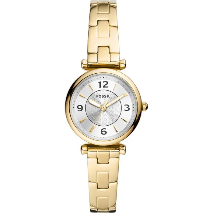 Delve into the exquisite elegance of the Fossil® Analogue 'Carlie' Women's Watch ES5203. This stunning timepiece is a true embodiment of sophistication, designed specifically for the modern woman who values both style and function. Featuring a delicate 28mm round case crafted from durable stainless steel, it offers a perfect combination of beauty and resilience. The lustrous gold case color is perfectly complemented by the radiant silver dial, which captures attention with its timeless charm. A luxurious mineral glass window protects the dial, ensuring durability while maintaining transparency and clarity. It’s the perfect accessory whether you’re dressing up for a special occasion or enhancing your everyday look. The watch is powered by a precise quartz movement, known for its reliability and accuracy. With a comfortable band length of 19cm and a width of 12mm, crafted from stainless steel, it promises a secure fit on your wrist. The gold band beautifully matches the case, creating a harmonious look that exudes sophistication. The fold-over clasp with a push-button ensures it stays in place and adds to its ease of wear. With a thickness of just 7mm, this watch offers a sleek profile that slips effortlessly beneath any outfit. Not only is it stylish, but it also boasts a water resistance of up to 5 bars, making it functional for various activities. The Fossil® Analogue 'Carlie' is truly a versatile addition to your collection, merging classic aesthetics with modern design.Shop Fossil ES5203 at Ormoda
