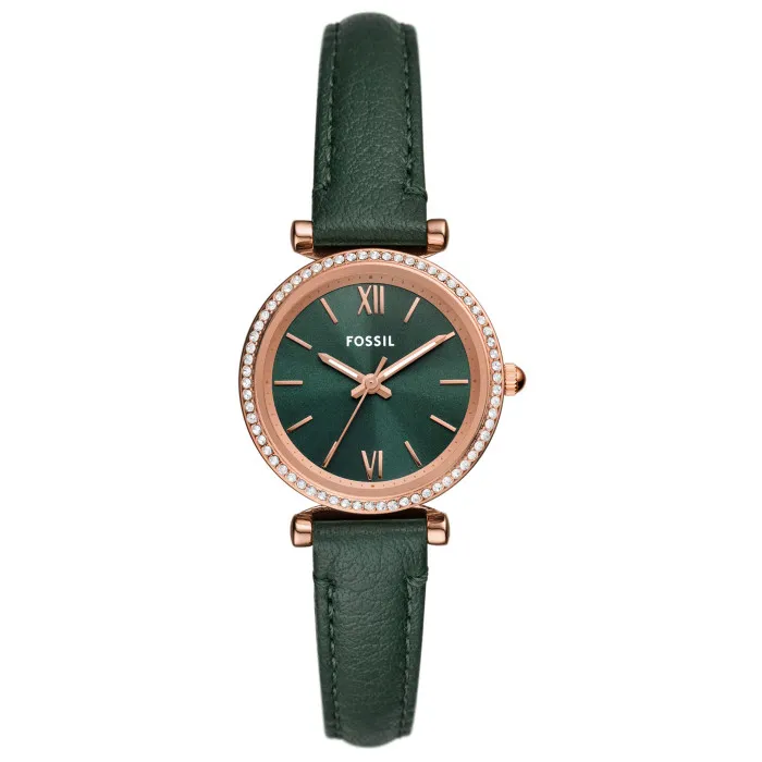 Meet the exquisite Fossil® Analogue 'Carlie' Women's Watch ES5370, a beautifully crafted timepiece that radiates elegance and sophistication. This dress watch features a stunning round case measuring 28mm in diameter and is made of durable stainless steel, plated in a glamorous rose gold. With a sleek thickness of only 7mm, it offers a refined silhouette that effortlessly complements any outfit. The allure of the watch is enhanced by its vibrant green dial, protected by resilient mineral glass, creating a striking contrast with the sparkling stone settings on the bezel. The Fossil Carlie is not only a fashionable accessory but also a practical one, equipped with precise quartz movement to ensure you stay on time. Its 5 ATM water resistance offers peace of mind for everyday wear while maintaining an unparalleled style. The green leather band adds a touch of freshness and comfort to the design, measuring 19cm in length and 12mm in width, secured with a reliable buckle clasp for a perfect fit. The lug to lug height is 34mm, providing a comfortable wear on the wrist while beautifully framing the enchanting dial. This watch is perfect for women who embrace both elegance and functionality, making it a must-have addition to your collection.Shop Fossil ES5370 at Ormoda