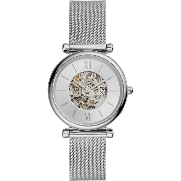 Introducing the alluring Fossil® Analogue 'Carlie' Women's Watch ME3176, a perfect blend of elegance and sophistication that beautifully embodies the essence of modern femininity. Crafted by the esteemed Fossil brand, this timepiece showcases the brand's unwavering commitment to quality, innovation, and style since its inception. Fossil is well known for creating classic and contemporary designs that resonate with today's fashion-forward women, while also featuring reliable craftsmanship that ensures longevity. Each piece reflects a vibrant spirit, making it the ideal accessory for both everyday wear and special occasions. The Fossil® Analogue 'Carlie' watch is designed with a rounded silver case, measuring 35mm in diameter and 11mm in thickness. This graceful silhouette is seamlessly complemented by a striking silver dial that boasts a sleek mineral glass window, providing a clear and elegant view of the time. Adorned with delicate details, it embraces femininity and is tailored to the sophisticated woman who loves to make a statement. With an automatic movement, you can trust that this watch keeps time impeccably, allowing you to focus on enjoying life’s moments. The 19cm stainless steel band, with a 16mm width, is polished to perfection, offering both comfort and durability. It features a fold-over clasp that ensures a secure fit on your wrist, measuring 39mm from lug to lug. Rated at 5 ATM, this watch is water-resistant, making it suitable for everyday wear without worrying about splashes or rain. At a feather-light weight of 68 grams, it’s a joy to wear, adding a touch of elegance to any outfit. Whether dressed up for an evening out or styled casually for a day in the city, the Fossil® Analogue 'Carlie' Women's Watch ME3176 will effortlessly elevate your look.