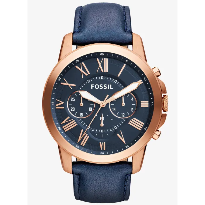 Fossil® Chronograph 'Grant' Men's Watch FS4835 embodies a perfect blend of sophistication and functionality designed for the discerning gentleman. Fossil, a brand with a rich heritage of watchmaking, has been known for creating timepieces that encapsulate both timeless styles and modern innovation. With a passion for crafting quality designs, Fossil continues to build on its reputation by offering watches that are not only stylish but also practical for everyday wear. Each piece reflects the brand's commitment to quality craftsmanship and reliability, making them cherished possessions for watch enthusiasts. This striking chronograph watch boasts a stunning blue dial that provides a captivating contrast against the rose gold case, enhancing its elegance. The round case is crafted from durable stainless steel, ensuring longevity, while the mineral glass dial window is designed to withstand the rigors of daily life. With a diameter of 44mm and a thickness of 12mm, the watch presents a bold yet refined appearance on the wrist. The watch is powered by a reliable quartz movement, ensuring accuracy and longevity. The blue leather band, measuring 21cm in length and 22mm in width, offers comfort alongside style and features a secure buckle clasp for peace of mind. With a water resistance rating of up to 5 bars, this watch is suitable for a variety of conditions, making it the ideal companion for both casual and formal occasions. The Fossil® Chronograph 'Grant' is not just a timepiece; it's a statement of elegance, designed for the modern man who values quality and style in every aspect of life.Shop Fossil FS4835 at Ormoda