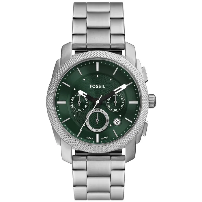Unleash your adventurous spirit with the Fossil® Chronograph 'Machine' Men's Watch FS6079. This remarkable timepiece is designed for those who appreciate durability combined with a rugged aesthetic. Constructed from high-quality stainless steel, its silver case showcases a modern round style, marked by a stellar diameter of 41mm and a thickness of 12mm. The striking green dial is not just a visual delight but also designed for functionality, featuring chronograph display capabilities and a handy date calendar. With mineral glass protecting the face and a water resistance of up to 5 bars, this watch is perfect for both casual wear and more formal occasions. The stainless steel band is not only stylish in its silver hue but also incredibly practical, measuring 22mm in width and 21cm in length, ensuring a comfortable fit wrapped around your wrist. This timepiece weighs a modest 156g, making it a perfect companion for your daily adventures. Each detail reaffirms Fossil's dedication to precision and style, allowing men to express their individuality while keeping track of time in style. Be it in a boardroom meeting or a weekend getaway, this watch seamlessly complements your look, proving that functionality can indeed be fashionable.Shop Fossil FS6079 at Ormoda
