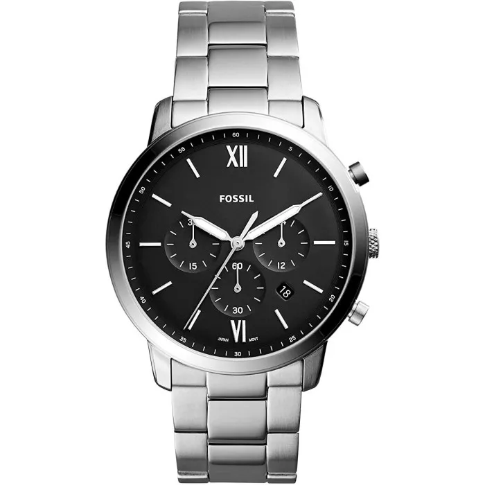 The Fossil® Chronograph 'Neutra Chrono' Men's Watch FS5384 marries style with function in a sophisticated package. This striking timepiece features a robust 44mm stainless steel case that combines durability with a sharp design. The sleek black dial is protected by mineral glass, reflecting a touch of elegance while offering clarity and resilience, allowing you to keep track of time precisely. Its versatile dress watch style ensures it fits seamlessly into both professional and casual settings, making it a perfect choice for the modern man. Beyond aesthetics, the Fossil Neutra Chrono is powered by a reliable quartz movement, ensuring accuracy and efficiency in telling time. The watch is designed with practicality in mind, featuring a date calendar for convenience. With a water resistance of up to 5 bars, this timepiece provides peace of mind for everyday wear, whether you're at the office or enjoying a night out. The easy-to-read chronograph display offers functionality that adds to its versatility. The stainless steel band complements the case, measuring 22mm in width and adjustable to fit a wrist length of 21cm, providing comfort without compromising on style. The fold-over clasp with a push-button mechanism ensures that your watch stays secure while also allowing for easy wear. Lightweight yet sturdy at just 116 grams, the Neutra Chrono conforms to your wrist's natural movements, making it ideal for all-day wear. This watch brings together tradition and innovation, embodying the quintessential Fossil ethos of creativity and craftsmanship in every detail.Shop Fossil FS5384 at Ormoda