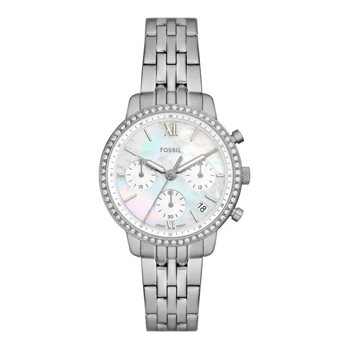 Introducing the stunning Fossil® Multi Dial 'Neutra' Women's Watch ES5357, a captivating timepiece that seamlessly blends elegance and practicality. Designed specifically for women, this watch features a round case crafted from durable stainless steel, measuring 36mm in diameter and 10mm thick. The soft glimmer of the silver color complements the luxurious mother of pearl dial, creating a sophisticated look for any occasion. The watch is powered by a precise quartz movement, ensuring accurate timekeeping while enhancing your daily routine. Its multi-dial display not only adds a unique flair but also features a convenient day-date function, allowing you to stay organized and stylish at the same time. With a water resistance of up to 5 bars, the Neutra is not only beautiful but also functional, making it perfect for everyday wear. Adding to its charm, the watch is adorned with stunning stone settings along the bezel, capturing light in a dazzling way. The stainless steel band, measuring 19cm in length and 15mm in width, features a fold-over clasp with a push-button for secure wearing. Weighing only 79g, this lightweight accessory promises comfort throughout the day while accentuating your wrist beautifully. Elevate your style with the Fossil® Multi Dial 'Neutra' – a must-have watch for every fashionable woman.Shop Fossil ES5357 at Ormoda