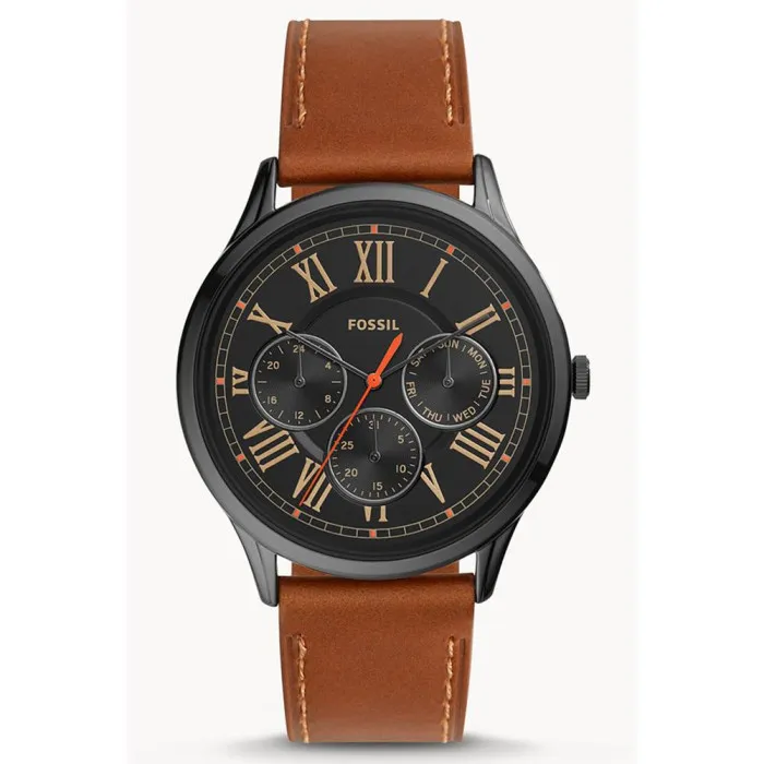 Fossil® Multi Dial 'Pierce' Men's Watch FS5702 is a testament to the modern man's need for functionality combined with style. This stunning timepiece features a sleek black alloy case, measuring 44mm in diameter and 9mm thick, ensuring a bold presence on your wrist. The watch's multi-dial display, protected by durable mineral glass, adds a layer of sophistication while providing essential information at a glance. With a day-date calendar feature, this watch is designed for those who appreciate practicality without compromising aesthetics. The striking black dial is beautifully complemented by a sturdy brown leather band, measuring 21cm in length and 21mm in width, bringing an earthy warmth to this sophisticated piece. The buckle clasp ensures a secure fit, allowing you to wear your watch with confidence whether you're in a professional setting or enjoying casual outings. Plus, it withstands a depth of 3 bars, making it resistant to water splashes, ensuring you can wear it in various environments. Crafted for the discerning gentleman, the Fossil® Multi Dial 'Pierce' Men's Watch balances style and function perfectly. The unique round case design provides a timeless appeal, making it a versatile accessory that complements any outfit, whether sophisticated or laid-back. With a weight of just 56 grams, it’s light enough for everyday wear yet substantial enough to be noticed, embodying the essence of contemporary menswear. This watch is not just an accessory; it is a statement piece that reflects your lifestyle and taste.Shop Fossil FS5702 at Ormoda