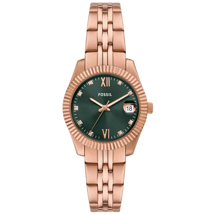 The Fossil® Analogue 'Scarlette' Women's Watch ES5369 is a splendid example of elegance and sophistication, designed especially for the modern woman who appreciates both style and substance. This dress watch features a stunning rose gold stainless steel case that measures 32mm in diameter, perfectly balancing size and comfort. The round case, with a thickness of just 9mm, offers a sleek silhouette that complements any attire, whether formal or casual. The mesmerizing green dial adds a refreshing twist, ensuring that this timepiece stands out beautifully on the wrist. Capped with durable mineral glass, the watch guarantees clarity and protection against scratches, making it a reliable companion for daily wear. The watch is powered by a precise quartz movement, ensuring accurate timekeeping, which is essential in today's fast-paced world. A date calendar function lies conveniently nestled on the dial, adding practicality to its charm. Designed with a robust water resistance of up to 5 bars, this watch can withstand splashes and raindrops, offering peace of mind no matter where you go. The rose gold stainless steel band is not only stylish but also boasts both form and function. Measuring 19cm in length and 16mm in width, it fits comfortably and securely around the wrist, fastened by a fold-over clasp with a push button. With a lug-to-lug height of 38mm, the watch sits gracefully on any wrist, making it an impeccable accessory for every occasion. The Fossil® Analogue 'Scarlette' promises to elevate your accessory game and draw attention wherever you go.Shop Fossil ES5369 at Ormoda