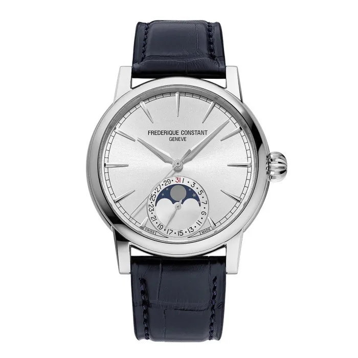 Introducing the Frederique Constant® Multi Dial 'Classic Moonphase' Men's Watch FC-716S3H6, a timepiece that harmoniously blends elegance with functionality. This remarkable watch is at the forefront of Swiss watchmaking craftsmanship, showcasing a commitment to precision and quality that has long characterized Frederique Constant. With roots tracing back to 1988, the brand has established a proud legacy of producing beautifully designed luxury watches, influenced by an appreciation for beauty, simplicity, and innovative technology. Each piece from Frederique Constant evokes a sense of timeless sophistication while ensuring that wearers can express their individuality through unique designs. The Frederique Constant Multi Dial 'Classic Moonphase' is designed with the modern gentleman in mind. With a case diameter of 40mm, its round stainless-steel case presents a stunning silvery hue that complements the intricate features of the watch. The silver dial, blessed with a sapphire glass window, boasts multi-dial functionality that enhances its overall charm and utility. With a daily calendar feature and a reliable automatic movement, this watch actively works to keep up with your dynamic lifestyle. The luxurious blue leather band, measuring 21cm long and 19mm wide, adds a touch of refined sophistication, securing with a practical deployment clasp that ensures a snug and comfortable fit on the wrist. With a thickness of 12mm, this timepiece is not overly cumbersome while still making a statement. It has a water resistance rating of 5 bars, making it suitable for everyday wear without compromising elegance. Whether for a formal occasion or a casual outing, the Classic Moonphase watch serves as an ideal companion, embodying professional luxury with masculine aesthetics. Experience the beauty and craftsmanship that only Frederique Constant can deliver with this exceptional timepiece.