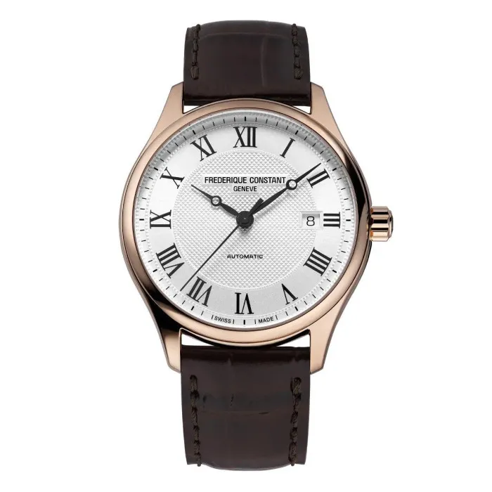 The Frederique Constant® Analogue 'Classics' Men's Watch FC-303MC5B4 is a splendid addition to any gentleman's wardrobe, embodying sophistication and elegance. This exquisite timepiece features a round stainless steel case with a stunning rose gold finish, measuring 40mm in diameter and 11mm in thickness. The silver dial, protected by sapphire glass, offers a refined backdrop that enhances its luxurious appeal. With automatic movement, this watch ensures precision and reliability, making it the perfect companion for both formal occasions and everyday wear. The watch is equipped with a date calendar, allowing you to stay organized in style. Completing this elegant watch is a rich brown leather band, measuring 21cm in length and 19mm in width, which adds a touch of warmth and comfort to its overall design. The band secures with a traditional buckle clasp, ensuring a snug fit on your wrist. Crafted for versatility, the Frederique Constant 'Classics' is designed for the discerning man who appreciates attention to detail. With an impressive water resistance of up to 5 bars, this watch offers durability alongside its aesthetic value. Whether worn at a business meeting or a formal event, this timepiece speaks volumes of your impeccable taste and class, making it an essential accessory for the modern gentleman.