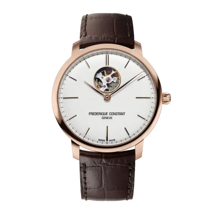 The Frederique Constant® Analogue 'Slimline Heart Beat' Men's Watch FC-312V4S4 is a stunning piece that perfectly captures the essence of both elegance and precision. This dress watch stands out with a sophisticated round case made from gleaming rose gold stainless steel, measuring an elegant 40mm in diameter and just 9mm thick. The dial is a tasteful silver, showcasing minimalist hour markers that embody luxury without overwhelming the eye. The sapphire glass protecting the dial ensures resilience and clarity, making it suitable for both day-to-day wear and formal occasions. Designed for the modern gentleman, this watch features an automatic movement, symbolizing the brand's commitment to craftsmanship and quality. A notable detail is the heart-shaped aperture showcasing the delicate inner workings of the watch, a testament to Frederique Constant’s dedication to horological excellence. The brown leather band is stitched to perfection, not only providing comfort but also ensuring a stylish fit for any wrist. A deployment clasp secures this exquisite piece, effortlessly combining functionality with aesthetics. With a water resistance of up to 3 bars, the watch is resilient against splashes and brief immersion. The overall weight of 56 grams gives it a substantial yet comfortable presence on the wrist, and with a lug-to-lug height of 44mm, it sits beautifully against the skin. Perfect for sophisticated events or daily wear, the Frederique Constant Slimline Heart Beat is the ideal accessory for any discerning man looking to elevate his style while making a lasting impression.