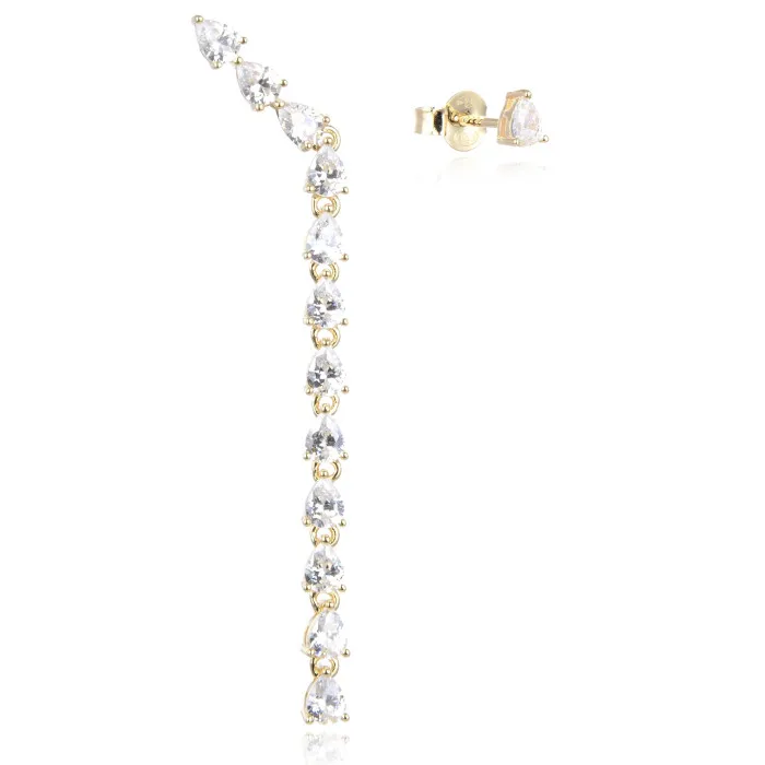 Introducing the Gena.paris® 'Shine' Women's Sterling Silver Drop Earrings - Gold GBO1352-Y, a captivating addition to any jewelry collection. These stunning earrings beautifully blend elegance with modern style, perfect for the sophisticated woman who appreciates the finer things in life. Crafted from 925 sterling silver and showcasing a radiant gold color, they are designed to catch the light in the most mesmerizing way. Each earring features a luxurious pear-shaped zirconium gem gleaming brilliantly against the metal, a total of thirteen exquisite gems ensure they stand out and elevate any outfit from casual to formal with ease. Measuring 6 cm in height and a delicate 0.3 cm in width, these drop earrings offer a graceful silhouette that enhances the natural beauty of the wearer. The butterfly back finding ensures comfort and security, allowing you to wear them with confidence all day long. Whether you're attending a special event, heading to an important meeting, or simply looking to add a touch of glamour to your everyday ensemble, these earrings are the ideal choice. The charming design and premium quality materials are hallmarks of the Gena.paris brand, which is renowned for its commitment to creating exquisite jewelry that speaks to the heart of every woman. These earrings are not just accessories; they are a statement of style, sophistication, and elegance that will leave a lasting impression.