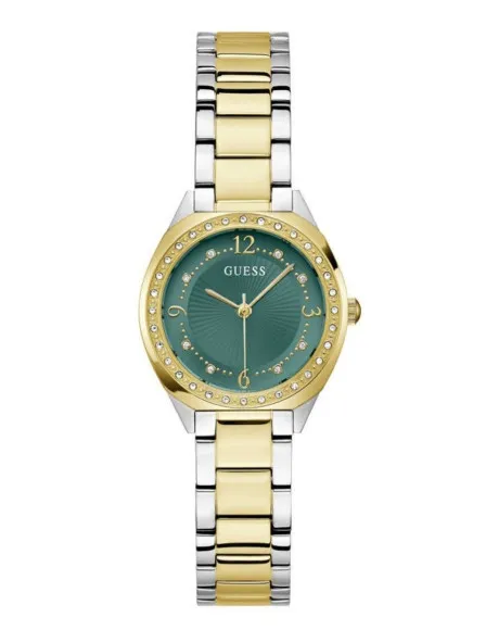 Discover the allure of the Guess® Analogue 'Charlotte' Women’s Watch, model GW0767L4, expertly designed to cater to the stylish and modern woman. This timepiece is more than just a watch; it is a fashion statement seamlessly blending elegance and functionality. The brand Guess is renowned for its captivating designs that appeal to those who appreciate style and quality. The Charlotte watch encapsulates this ethos with its striking multicolour stainless steel case, making it easy to pair with any outfit, whether casual or formal. The round watch face boasts a mesmerizing green dial that catches the eye, complemented by a durable mineral glass window that ensures longevity and clarity. With a case diameter of 30mm and a thickness of 8mm, it stands out while still feeling comfortable on the wrist. The watch's bezel, adorned with beautiful stone settings, adds a touch of glamour that makes it perfect for special occasions or daily wear. This timepiece operates on a reliable quartz movement, ensuring accuracy you can depend on while exuding sophistication. With a band length of 19cm, width of 14mm, and designed in vibrant multicolours, it enhances your wrist's charm. The fold-over push button clasp offers security, making it easy to wear and remove as required. Notably, the Charlotte watch boasts a water resistance rating of 3 bars, allowing for peace of mind during everyday activities. Elevate your accessory collection with this stunning piece that showcases your unique style and confidence.