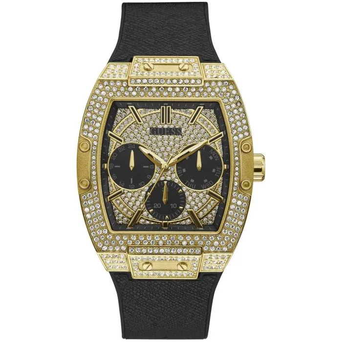 Introducing the Guess® Multi Dial 'Phoenix' Men's Watch GW0048G2, a masterpiece that embodies strength and sophistication. This timepiece is designed for the modern man who values both style and functionality. The watch features a striking gold case made from durable stainless steel, showcasing a distinctive tonneau shape that sets it apart from traditional designs. With a case length of 50mm and a thickness of 11mm, it seamlessly combines boldness with comfort, resting lightly on your wrist. The luxurious gold-toned dial is enhanced with multiple dials, allowing you to effortlessly keep track of time while adding a contemporary flair to your look. The striking mineral glass window ensures optimal visibility, while the day-date calendar function keeps your schedule organized at a glance. Equipped with a reliable quartz movement, you can trust that this watch will always keep precise time. The black silicone band, measuring 21cm in length and 24mm in width, offers not only flexibility and comfort but also a sporty aesthetic completing the overall look. With a water resistance of up to 5 bars, this timepiece is perfect for everyday wear, whether you're navigating the boardroom or enjoying a casual outing. Elevate your style with the Guess® Multi Dial 'Phoenix', where versatile design meets impeccable function. This watch is more than just an accessory; it's a statement piece that reflects your personality and ambitions, making it an essential addition to any man's collection.