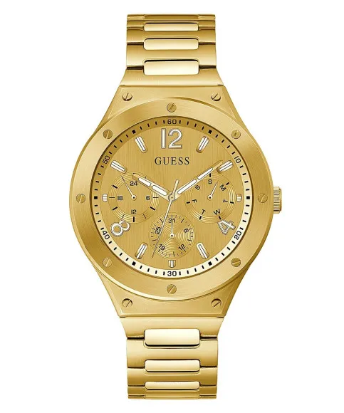 Experience a fresh perspective on watch-wearing with the Guess® Multi Dial 'Scope' Men's Watch GW0454G2. This stylish piece combines functionality with eye-catching aesthetics, making it the perfect accessory for men who appreciate both casual elegance and modern design. Crafted with a durable gold-tone stainless steel case, this timepiece boasts a dynamic multi-dial display that effectively accommodates daily activities and distinctive style preferences. Its bold 44mm round case, paired with a sleek 10mm thickness, presents a confident stature on the wrist. The watch is adorned with a luxurious gold dial, protected by resilient mineral glass, ensuring optimal visibility and durability in your everyday endeavors. The sophisticated gold band complements the case beautifully, measuring 21cm in length and 20mm in width, and offers both comfort and secure fit with its fold-over push-button clasp. Designed with practicality in mind, the watch features a day-date calendar, making it an ideal companion for busy professionals and enthusiasts alike. With a water resistance of up to 5 bars, this watch stands up to daily splashes and even outdoor adventures. Weighing just 148 grams, it strikes the perfect balance between sturdiness and comfort. The Guess® Multi Dial 'Scope' Men's Watch is not just a timepiece, but a symbol of ambition, making it perfect for modern men on the go.