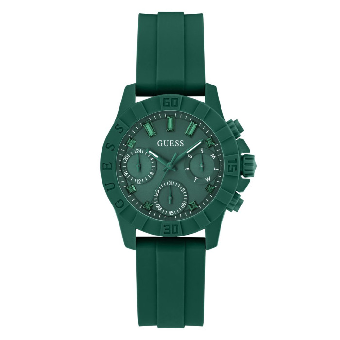 Step into the world of vibrant elegance with the Guess® Multi Dial 'Sportstar' Women's Watch GW0775L3. This stunning timepiece is not just a watch; it's a statement of style and functionality. A perfect match for the modern woman, this watch boasts a chic round case crafted from durable resin, exemplifying both contemporary fashion and lasting quality. The captivating green hue of the watch case, 38mm in diameter and 12mm thick, reflects a trendy and energetic spirit, while the mineral glass window ensures durability and protection against daily wear and tear. The eye-catching multi-dial design offers not only a stylish aesthetic but also the practicality of displaying more than just the time. As you glance down at your wrist, the vibrant green dial combines functionality with flair, making it a perfect accessory for any outfit, whether casual or dressy. Equipped with a day-date calendar function and a water-resistance rating of 3 bars, this watch caters to your active lifestyle without compromising on style. The green silicone band, measuring 19cm in length and 18mm in width, cradles your wrist in comfort while providing an adjustable fit secured by a reliable buckle clasp. Weighing only 40.8 grams, the Sportstar watch feels light yet durable, making it easy to wear throughout the day. Embrace your adventurous side with a timepiece that is as bold and beautiful as you are. The Guess® Multi Dial 'Sportstar' Women's Watch GW0775L3 is not just about telling time; it's about making timeless memories.