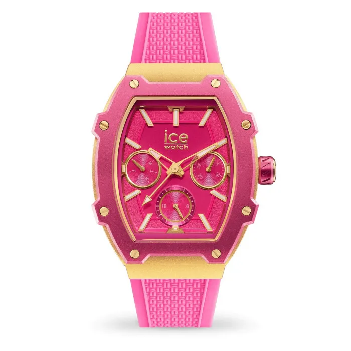 Introducing the Ice Watch® Multi Dial 'Ice Boliday - Wild Pink' Women’s Watch 023288, a perfect blend of casual elegance and vibrant style. This exquisite timepiece features a dynamic multi-dial design, showcasing a delightful pink face that exudes femininity and fun. The watch case, crafted from lightweight aluminium and colored in a shimmering gold, measures 45mm in length and 35mm in width, providing a modern tonneau shape that is both chic and comfortable on the wrist. With a thickness of just 11mm, it comfortably fits beneath any cuff, making it an ideal accessory for various occasions. The watch is equipped with a reliable quartz movement, ensuring accuracy for the busy woman on the go. Furthermore, it offers practical functionality with a day-date calendar, beautifully integrated into the design without compromising the aesthetic appeal. The pink silicone band, measuring 19cm in length and 19mm in width, is soft and flexible, making it easy to wear all day long, while the sturdy buckle clasp ensures a secure fit. This stunning piece is not just about looks; it is also built to withstand everyday adventures with an impressive water resistance of up to 5 bars. The mineral glass dial window provides durability while allowing the playful pink tones to shine through. Weighing only 52 grams, this timepiece feels light and airy, making it a delightful addition to your watch collection. The Ice Watch® Multi Dial 'Ice Boliday - Wild Pink' is not just a watch; it is a statement of joy, style, and vibrant femininity.