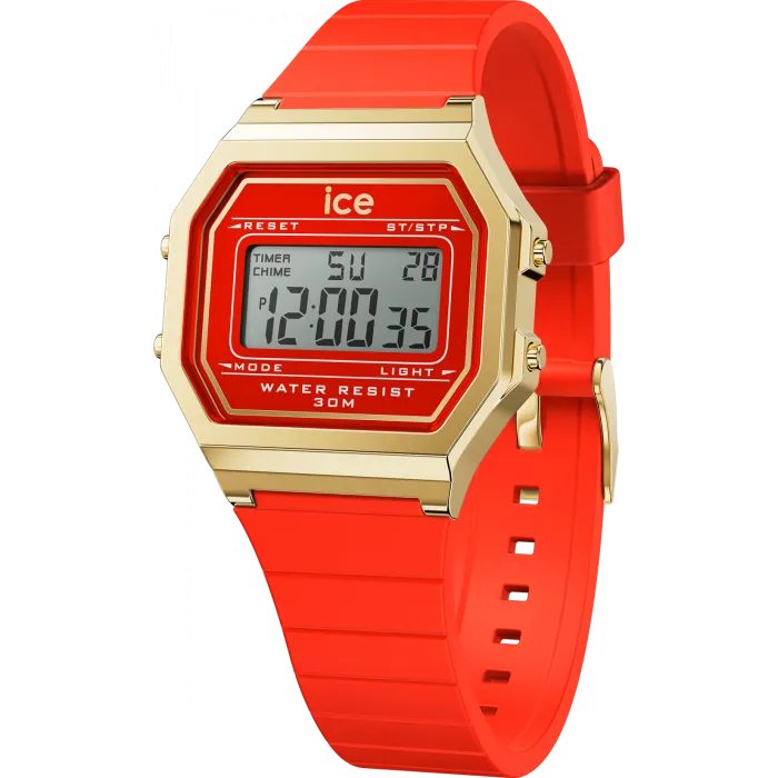 Introducing the Ice Watch® Digital 'Ice Digit Retro - Red Passion' Women's Watch 022070, an exquisite blend of style and functionality crafted for the modern woman. This casual piece emanates a playful elegance with its vibrant red color and sleek gold accents, making it not just a timepiece but a statement accessory. The square resin case measures 34mm, with a thickness of just 8mm, ensuring comfort alongside its striking design. The bold red dial, protected by mineral glass, features a digital display that offers essential functions like a stopwatch, dual time, and an alarm, all illuminated by a convenient light feature. With a water resistance of up to 3 bars, it’s perfect for everyday wear as well as adventurous outings. The silicone band is designed with both style and practicality in mind; it boasts a length of 19cm and a width of 17mm, securely fastened with a buckle clasp for ease of wear. The watch also features a day-date calendar, allowing you to keep track of your busy schedule with style. Weighing in at only 25 grams, this timepiece is light yet durable, making it an ideal choice for the dynamic woman who embraces both grace and resilience in her accessories. Make every moment count with the Ice Digit Retro, where vibrant design meets reliable functionality.