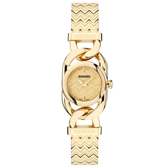 Introducing the Missoni® Analogue 'Gioiello' Women's Watch MWSL01022, a stunning accessory that embodies elegance and sophistication in every detail. This distinguished piece is crafted with a gold stainless steel case, featuring a round design with a 22mm diameter and an 8mm thickness, ensuring a delicate yet sturdy silhouette. The exquisite gold dial, protected by sapphire glass, radiates a luxurious glow and offers an effortless glimpse into time, boasting an analogue display that is both functional and chic. The watch is powered by a reliable quartz movement, ensuring precise timing while maintaining a timeless aesthetic. The gold stainless steel band stretches out to 19cm, perfectly balancing comfort with style, while the 14mm width adds a refined touch. With a deployment clasp fastening, this watch is easy to wear, securely resting on your wrist. Designed for the modern woman, the Missoni® 'Gioiello' is not just a timepiece but a statement of taste and luxury. It’s water-resistant up to 3 bars, making it versatile for various occasions, from elegant soirée to a casual brunch. This watch combines practicality with exquisite style, making it an ideal complement to any outfit, enhancing your overall elegance and completing your look flawlessly. Shop Missoni MWSL01022 at Ormoda