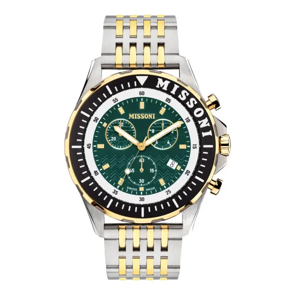 The Missoni® Chronograph 'Urban' Men's Watch MWJD00422 is a quintessential piece that embodies a seamless blend of style and functionality. Engineered for the modern man, this watch is not merely a timepiece; it is a statement of individuality. Featuring a striking multicolour case that measures a bold 45mm in diameter, the watch makes an impression with its round stainless steel construction and an elegant thickness of 12mm. The vibrant green dial is protected by a durable sapphire glass window, ensuring that not only does it look appealing, but it also withstands the rigors of everyday wear. Designed for those who appreciate versatility, the multicolour band is crafted from stainless steel and boasts an impressive length of 21cm and a width of 22mm, pairing beautifully with the stunning case. The deployment clasp offers ease and security, allowing you to wear this exquisite timepiece with confidence. With a quartz movement at its heart, precision is guaranteed, making this watch an optimal choice for daily use and special occasions alike. A functional date calendar adds a practical touch to its overall design. This model is water-resistant up to 5 bars, meaning you can embrace your lifestyle without the fear of damaging your new favorite accessory. The classic yet contemporary design of this Missoni watch makes it suitable for any casual setting, ensuring that you always look your best, whether at a lunch meeting or a weekend getaway. With its impeccable style and reliable performance, the Missoni Chronograph 'Urban' promises to be a valuable addition to any discerning man’s collection.Shop Missoni MWJD00422 at Ormoda