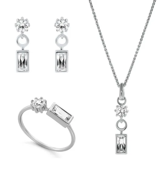 Introducing the Orphelia® 'Madelyn' Women's Sterling Silver Set: Necklace + Earrings + Ring - Silver SET-7583, a stunning combination of elegance and sophistication crafted specially for the modern woman. This exquisite jewelry set reflects the artistry and passion that Orphelia puts into creating unique pieces that stand the test of time. Founded with the mission to accentuate beauty and style, Orphelia is renowned for its attention to detail and the use of high-quality materials. Each piece symbolizes grace, femininity, and charm, making it a perfect addition to any woman's collection. The use of Zirconium stones adds a touch of sparkle that will surely draw attention wherever you go, showcasing your impeccable taste. The 'Madelyn' set is designed to elevate your wardrobe and make you feel extraordinary. The necklace features a delicate spiga chain that adjusts from 42 to 45 cm, ensuring a perfect fit for any neckline. The lobster claw clasp guarantees security while maintaining an elegant look. Complementing the necklace are matching earrings, designed with butterfly back findings for comfort and style. Completing this stunning ensemble is a beautifully crafted ring, meticulously designed to enhance your allure. The set boasts eight lustrous white zirconium stones shaped in baguettes, strategically placed to capture and reflect light in the most enchanting manner. Each piece is made from 925 Sterling Silver, known for its durability and beauty, providing a radiant finish that lasts. Wearing this set will empower you, perfect for both casual and formal occasions.