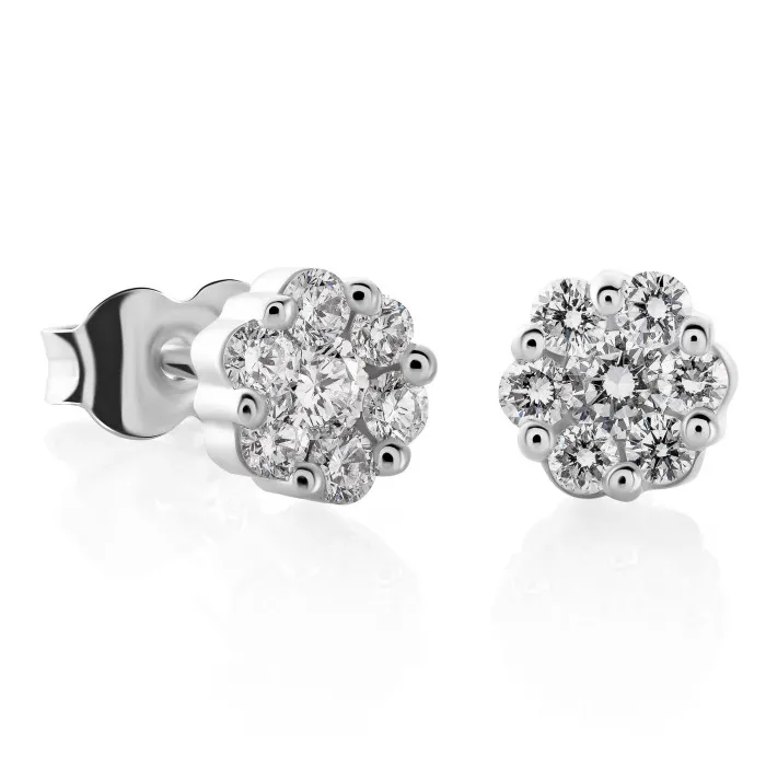 The Orphelia® 'Norvina' Women's Whitegold 18C Stud Earrings - Silver OD-5327 are truly a radiant addition to any jewelry collection. Crafted for the modern woman, these exquisite earrings encapsulate elegance and sophistication. Expertly crafted from 18-carat white gold, the earrings exhibit a stunning brilliance that is sure to catch every eye. With a total diamond weight of 0.50 carats, the carefully selected diamonds are graded for their exceptional clarity and color, featuring small inclusions and a rare white/Top Wesselton classification. Each of the fourteen brilliantly cut diamonds is set in a way that maximizes their sparkle and shines, all while maintaining a comfortable yet secure fit on the ear with a butterfly back finding. Measuring 0.7 cm in diameter, these earrings are perfect for both everyday wear and special occasions, offering a versatile style that complements any outfit. The translucent quality of the white gold finish adds an extra touch of luxury, ensuring that these earrings are not just accessories but true statement pieces. Enhance your elegance and elevate any look with the timeless beauty of the Norvina earrings.