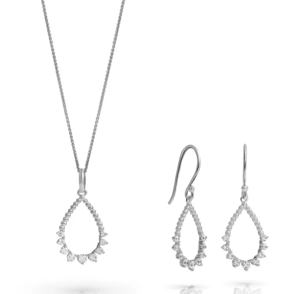 The Orphelia® 'Petal' Women's Sterling Silver Set: Necklace + Earrings SET-7564 is a stunning representation of elegance and femininity. Crafted with care, this exquisite jewelry set embodies the natural beauty of floral designs, capturing the essence of soft petals with its graceful curves and sparkling accents. Each piece is meticulously made from 925 sterling silver, offering a radiant shine that complements any outfit, from casual brunches to formal events. The necklace features a spiga chain that elegantly enhances the neckline, with a length adjustable from 42 to 45 cm, ensuring a perfect fit for every woman. The graceful lobster claw clasp secures the necklace, providing comfort and ease for daily wear. The earrings, designed to dangle gracefully, feature a hook back finding that provides a secure and stylish fit. Each earring is adorned with a total of 27 round zirconium gems, radiating a brilliant white sparkle that captures the light beautifully. With a height of 3.3 cm and a width of 1.4 cm, they are designed to flatter various face shapes while adding a touch of glamour. This set celebrates the essence of nature, making it not only a beautiful accessory but also an expression of artistry and craftsmanship. The delicate zirconium stones sparkle daintily, creating a look that is both sophisticated and timeless. Ideal for gifting or treasuring for oneself, this jewelry set is a testament to refined style and elegance, perfect for women who appreciate the finer things in life.Shop Orphelia SET-7564 at Ormoda