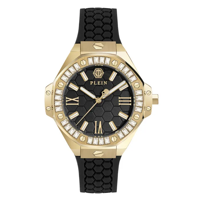 Introducing the exquisite Philipp Plein® Analogue 'Plein Lady Royal' Women's Watch PWBDA0424, a perfect harmony of luxury and elegance created for the modern woman. This stunning timepiece showcases not only the superior craftsmanship synonymous with the brand but also a chic design that speaks to the sophistication and self-assurance found within every wearer. Crafted from high-quality stainless steel, the gold-toned watch case boasts a polished finish that radiates opulence, while the 39mm round case is complemented by an alluring black dial that presents a striking contrast, embellished with sophisticated stone settings on the bezel. Designed for the discerning woman, this watch seamlessly combines form and function with its reliable quartz movement that guarantees precise timing. The mineral glass dial window adds a layer of durability, while the bold black silicone band, measuring 19cm in length, ensures comfort and flexibility for daily wear. With a lug-to-lug height of 49mm and a case thickness of just 10mm, the timepiece sits delicately on the wrist, providing an effortlessly chic aura whether at work or at a glamorous event. Water-resistant up to 5 bars, the 'Plein Lady Royal' is a prepared companion for every occasion, offering ease and elegance in one reliable accessory. Shop Philipp Plein PWBDA0424 at Ormoda