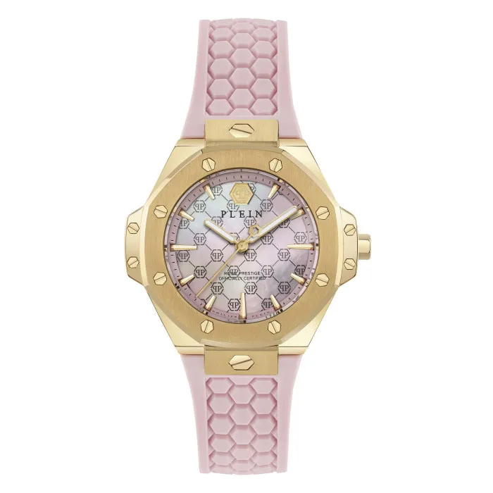 The Philipp Plein® Analogue 'Plein Royal Prestige' Women's Watch PW4FA0225 is the epitome of elegance and sophistication. This stunning timepiece showcases a gleaming gold stainless steel case that gracefully encases a mesmerizing mother-of-pearl dial. With a diameter of 33mm and a thickness of 9.05mm, it presents a perfect balance between boldness and femininity. The watch’s analogue display is protected by mineral glass, ensuring durability while allowing the enchanting dial to shine brightly. Additionally, the watch is designed for women who appreciate a touch of glam and functionality as it maintains a water-resistant rating of 5 bars, providing peace of mind during daily wear. The chic pink silicone band complements the watch beautifully, featuring an 18mm width and a length of 19cm, providing comfort and style for all-day wear. The buckle clasp secures the watch effortlessly on the wrist, making it not just an accessory but a staple in any woman’s jewelry collection. The sleek design and luxurious materials create a timeless piece that can transition seamlessly from day to night. This watch combines practicality with a distinctive flair, making it ideal for both casual outings and elegant soirées. Whether you are treating yourself or gifting this exquisite piece to a special woman in your life, the Plein Royal Prestige is sure to captivate and inspire. It is more than just a watch; it is a statement piece that reflects personal style and confidence. Let the beauty of the Philipp Plein brand adorn your wrist with this fashion-forward timepiece that is destined to become a cherished favorite.Shop Philipp Plein PW4FA0225 at Ormoda