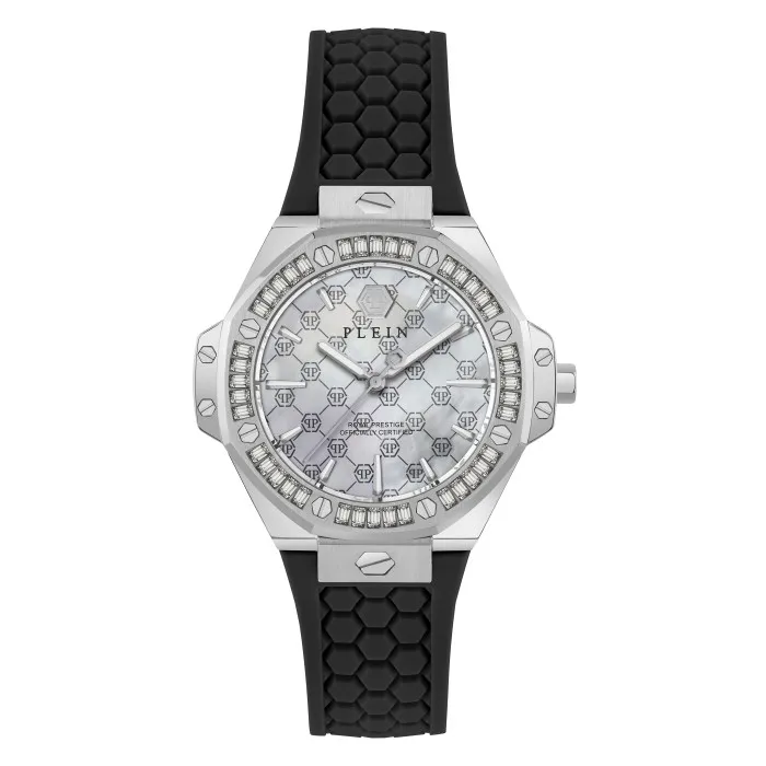 The Philipp Plein® Analogue 'Plein Royal Prestige' Women's Watch PW4FA0325 is a stunning embodiment of luxury and sophistication. Crafted with meticulous attention to detail, this watch features a striking round case made from high-quality stainless steel. Measuring 33mm in diameter, its elegant silver case provides the perfect backdrop for the captivating mother of pearl dial, which exudes a refined charm. The mineral glass window ensures durability while enhancing the watch's overall visual appeal. This timepiece boasts a distinguished appearance with stone settings around the bezel, adding an extra touch of opulence that is sure to catch the eye. Designed with comfort and practicality in mind, the watch is fitted with a chic black silicone band that not only provides durability but also complements the watch's elegant aesthetics. With a length of 19cm and a width of 18mm, the band secures using a deployment clasp that ensures a snug fit on your wrist. This watch also offers an impressive water resistance of up to 5 ATM, allowing for everyday wear without worry. With a lightweight design, tipping the scales at just 58 grams, it is an ideal accessory for women who appreciate style combined with functionality. The quartz movement provides precise timekeeping, making it a perfect companion for both formal occasions and casual outings. Embrace the luxurious allure of the 'Plein Royal Prestige' and let it elevate your distinctive style, whether at a gala or during everyday activities.Shop Philipp Plein PW4FA0325 at Ormoda