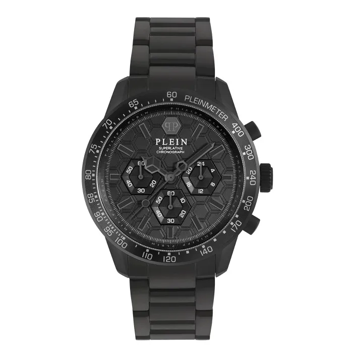 Philipp Plein® Chronograph 'Pleinmeter' Men's Watch PWPYA0624 exudes an air of sophistication and power. Designed for the modern man who appreciates fine craftsmanship, this timepiece combines striking aesthetics with reliable performance. The elegant black stainless-steel case has a diameter of 44mm, presenting a bold statement on your wrist. Its round design is complemented by a sleek 11mm thickness, making it not just a functional accessory, but a striking piece of art. The black dial, fortified with mineral glass, showcases an eye-catching tachymeter function, providing precision for those who appreciate speed and accuracy. The watch features a deployment clasp that ensures a perfect fit for a comfortable wear throughout the day. With a 21cm long black stainless-steel band, the watch melds perfectly with the wrist while adding a luxurious touch. Its design is not only suitable for casual wear but also elevates formal attire, making it an exquisite choice for any occasion. With an impressive water resistance of 5 bars, this watch is built to withstand splashes and brief immersions, adding practicality to its luxurious design. Each element has been carefully considered to ensure that this timepiece embodies the spirit of modern masculinity while providing the functionality expected of a premium chronograph.