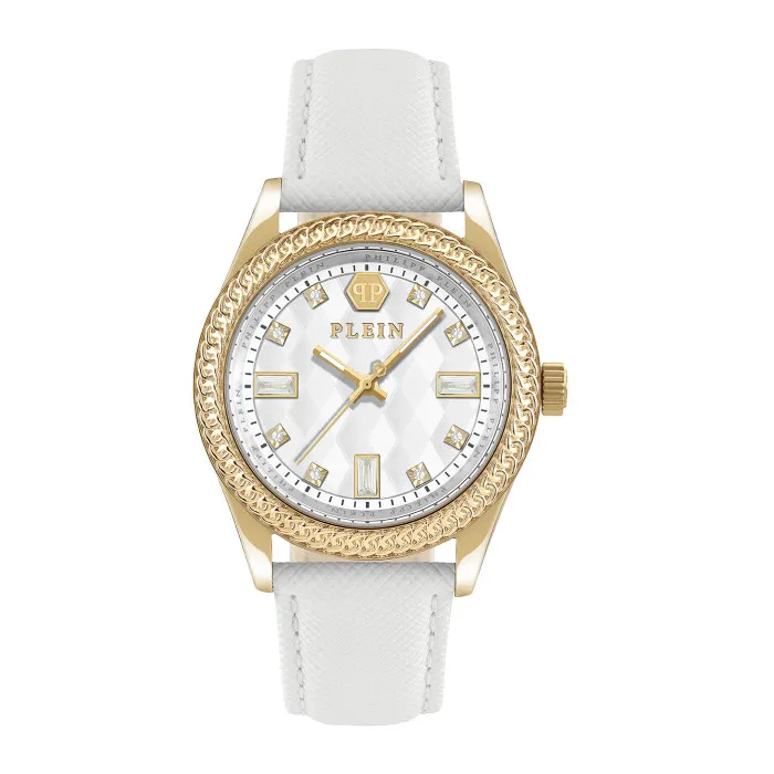 The Philipp Plein® Analogue 'Queen' Women's Watch PWCDA0324 is a true masterpiece that encapsulates the spirit of luxury and elegance. This stunning timepiece showcases a round case crafted from high-quality stainless steel, adorned in a sumptuous gold color that radiates sophistication. Measuring 38mm in diameter and 11mm in thickness, the watch presents a perfect balance of boldness and grace, making it an exquisite accessory for the modern woman who appreciates finer things. The silver dial adds a touch of brilliance, enhanced by the protective mineral glass, ensuring that your watch remains as pristine as the day you first wore it. Designed with practicality in mind, this watch features a reliable quartz movement, ensuring precision in every tick. The white leather band, extending to 19cm with a width of 19mm, is as comfortable as it is stylish, making it perfect for everyday wear or special occasions. The buckle clasp offers a secure fit, allowing you to wear your watch with confidence. Additionally, it boasts a water resistance of up to 5 bars, making it a versatile choice for those who live life to the fullest. The Philipp Plein® 'Queen' watch is not just a timepiece; it is an artful expression of your unique style. Whether you’re dressing up for an elegant evening out or looking to add a regal touch to your everyday attire, this watch makes a statement that is as bold and enchanting as its name. It embodies the essence of femininity while exhibiting a professional allure, ensuring you turn heads and steal the spotlight wherever you go.