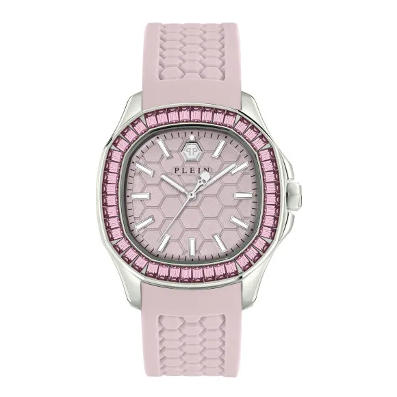 Introducing the Philipp Plein® Analogue '$pectre Lady' Women's Watch PWTAA0123, an exquisite blend of elegance and contemporary chic. This timepiece reflects the brand's ethos of luxury and bold style, making it more than just a watch, but an essential fashion accessory for the modern woman. Philipp Plein has long been recognized for its daring designs that push the boundaries of traditional fashion, captivating those who refuse to go unnoticed. The '$pectre Lady' collection exemplifies the brand's dedication to quality with a flair for the dramatic, offering pieces that resonate with confidence and sophistication. Crafted from high-quality materials, this watch is designed for those who value both style and functionality. Precise quartz movement ensures impeccable timekeeping, while the striking pink dial provides a vibrant contrast against the shimmering silver case. The round, stainless steel case, with a diameter of 38mm and a thickness of 9mm, is beautifully complemented by stone settings on the bezel, exuding opulence. The silicone band is not only stylish in pink but also comfortable, measuring 19cm in length and 19mm in width. The buckle clasp secures the watch firmly on the wrist, while it offers water resistance up to 5 bars, making it suitable for everyday activities. With its unique blend of feminine charm and professional appeal, the Philipp Plein® '$pectre Lady' Watch is a statement piece that every woman deserves to wear.
