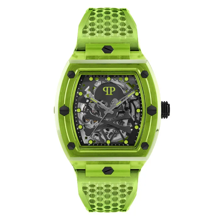 Elevate your style with Philipp Plein® Analogue 'The $keleton Crystal' Men's Watch PWPTA0124, an extraordinary blend of sophistication and ruggedness. This timepiece embodies the essence of modern luxury, engineered for those who embrace both elegance and edginess in their personal style. Crafted with meticulous attention to detail, this watch features a striking black dial encased in a resilient green resin case, with a unique tonneau shape that enhances its bold aesthetic. Measuring 44mm in length and 42mm in width, it strikes the perfect balance between presence and comfort on the wrist. The watch also boasts a thickness of 14mm, ensuring durability without compromising on style. The movement is powered by a precise quartz mechanism, providing reliability alongside its striking looks. The black dial is protected by scratch-resistant mineral glass, allowing you to wear this watch with confidence in any environment. Designed for the modern man, the watch showcases a vivid green band made from high-quality plastic, which is both lightweight and comfortable. With a band width of 26mm and an adjustable length of 21cm, it fits snugly on any wrist. Completing the look is a secure buckle clasp, ensuring it stays in place during your daily adventures. With a water resistance rating of up to 5 bars, this watch is ready for everyday challenges, making it a versatile addition to your collection. Make a statement with this unique timepiece that is bound to capture attention and admiration.Shop Philipp Plein PWPTA0124 at Ormoda
