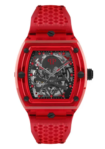 Philipp Plein® Analogue 'The $keleton Crystal' Men's Watch PWPTA0224 challenges the norms of traditional watch design with its striking appearance and bold character. Built for men who admire luxury and audacity, this timepiece showcases a unique blend of style and functionality. The watch features a red resin case measuring 44mm in length and 42mm in width, giving it a robust stature that demands attention. At a thickness of 14mm, it elegantly hugs the wrist while making a loud statement. Crafted with a tonneau style case, it radiates confidence and sophistication. The watch boasts a captivating black dial, elegantly concealed under mineral glass, ensuring clarity and resistance against everyday wear. The eye-catching hues of red continue through to the band, made of durable plastic that measures an impressive 21cm in length and 26mm in width, fitting comfortably around the wrist. This timepiece is fastened securely with a traditional buckle clasp, allowing for both easy adjustments and a firm hold. Designed with a quartz movement, reliability is guaranteed, ensuring it remains functional through all of life’s adventures. Water-resistant up to 5 bars, it invites you to pursue life’s passions without the worry of damaging your watch. The Philipp Plein® Analogue 'The $keleton Crystal' is not just a watch; it is a statement, a piece of art that reflects the wearer’s unique style and personality, making it essential for those who truly value luxury timepieces.