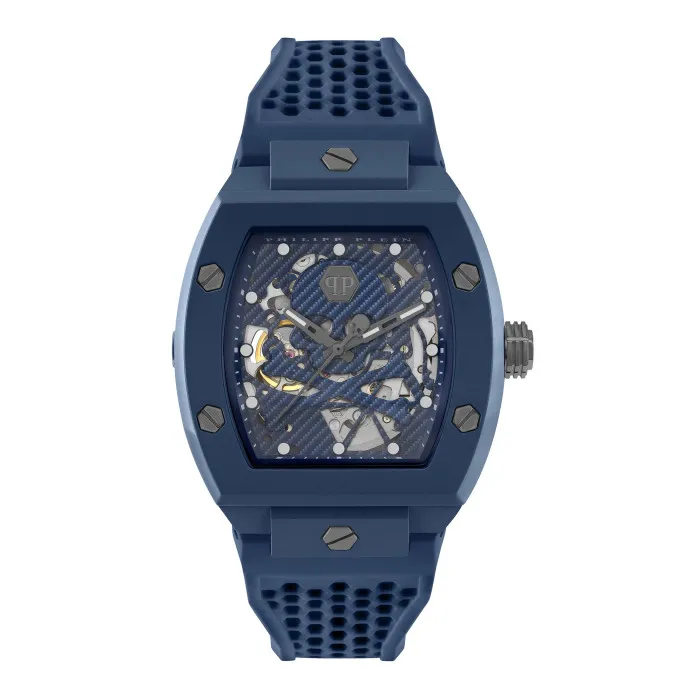 Discover the captivating allure of the Philipp Plein® Analogue 'The Skeleton Ecoceramic' Men's Watch PWVBA0323, where sophistication meets a bold, dynamic design. This exquisite piece features a striking blue color palette that draws attention while exuding a sense of refined elegance. Crafted with a durable resin case, this timepiece stands out with its unique tonneau style. Measuring 44mm in diameter and 14mm in thickness, it balances sturdiness with comfort, ensuring a perfect fit on your wrist. The watch's automatic movement guarantees precision, bringing together advanced technology and luxurious aesthetics. The skeleton dial, protected by sleek mineral glass, invites you to witness the intricate mechanisms inside, enhancing your connection to timekeeping. The vibrant blue display is complemented by an easy-to-read analogue format, making it as practical as it is stylish. The comfortable silicone band measures an impressive 21cm in length and 28mm in width, designed to provide comfort throughout your day while securely fastening with a sturdy buckle clasp. With a water resistance rating of 5 bars, this watch is equally fit for everyday wear and exceptional adventures. Philipp Plein’s dedication to craftsmanship is exemplified in the details - from the robust lug height of 56mm to the overall lightweight feel of just 72 grams. This watch is not just a timepiece but a statement of style, perfect for the modern man who values luxury and functionality.