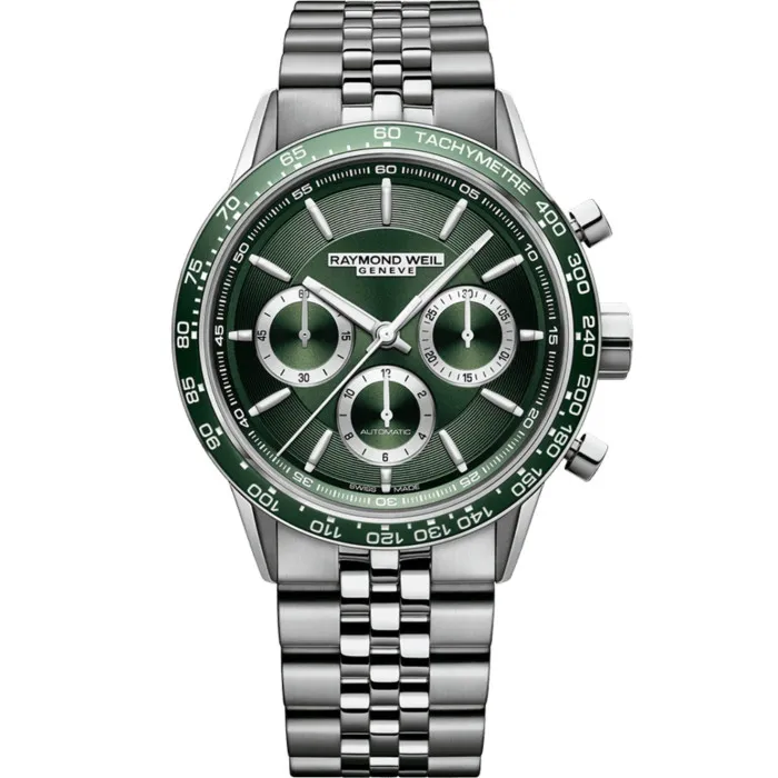 Introducing the Raymond Weil® Chronograph 'Freelancer' Men's Watch 7741-ST7-52021, a masterful blend of luxury and precision for the discerning gentleman. This exceptional timepiece showcases an automatic movement, ensuring you experience the utmost reliability and precision with every tick. The 43.5mm round case is crafted from high-quality stainless steel and is designed to withstand the rigors of daily wear while radiating elegance. A striking green dial draws the eye, accentuated by luminous hands that provide visibility in low-light conditions. The watch is equipped with a tachymeter function, which is not only stylistically appealing but also practical for timing events with impressive accuracy. Gliding over the dial, the sapphire glass offers superior scratch resistance, preserving the watch's breathtaking aesthetics. With a case thickness of 14mm and a lug-to-lug height of 51mm, the ergonomic design fits comfortably on the wrist, combining both style and substance. Securing the watch in place is a beautifully crafted stainless steel band, spanning 21cm in length and 21mm in width. The deployment clasp ensures a snug yet comfortable fit for everyday wear. Rated to 10 bars of water resistance, this watch is as versatile as it is handsome, making it an ideal companion for any occasion. The Swiss Made descriptor adds to its prestige, as it embodies the time-honored tradition of exceptional craftsmanship. Embrace sophistication and elevate your style with this iconic timepiece, designed to be both functional and fashionable for the modern man.
