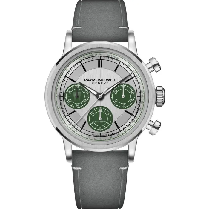 Experience the exquisite craftsmanship of the Raymond Weil Chronograph 'Millesime Tri-compa Largo Winch Limited Edition' Men's Watch 7765-STC-LAR01. An embodiment of luxury and sophistication, this timepiece showcases an automatic movement that ensures precision and reliability, perfect for the modern man who values elegance. The beautifully crafted round case, composed of high-quality stainless steel, features a stunning silver dial that gleams with sophistication. Measuring 39.5mm in diameter and 13mm in thickness, it is designed to make a statement while remaining comfortable on the wrist. Enhanced by a sapphire glass window, this watch offers durability and scratch resistance, promising to keep your timepiece looking pristine for years to come. The unique grey leather band, measuring 21cm in length and 21mm in width, adds a touch of refined style, secured with a reliable buckle clasp for a snug fit. This limited edition model not only represents a remarkable design but also showcases the commitment to excellence that Raymond Weil is renowned for. It is water-resistant up to 5 bars, making it suitable for various occasions whether you are at the office, on an adventure, or enjoying an evening out. The chronograph feature provides added functionality for the man who appreciates both style and performance. With a weight of only 80 grams, it perfectly balances presence and comfort, allowing for all-day wear without compromise. Shop Raymond Weil 7765-STC-LAR01 at Ormoda