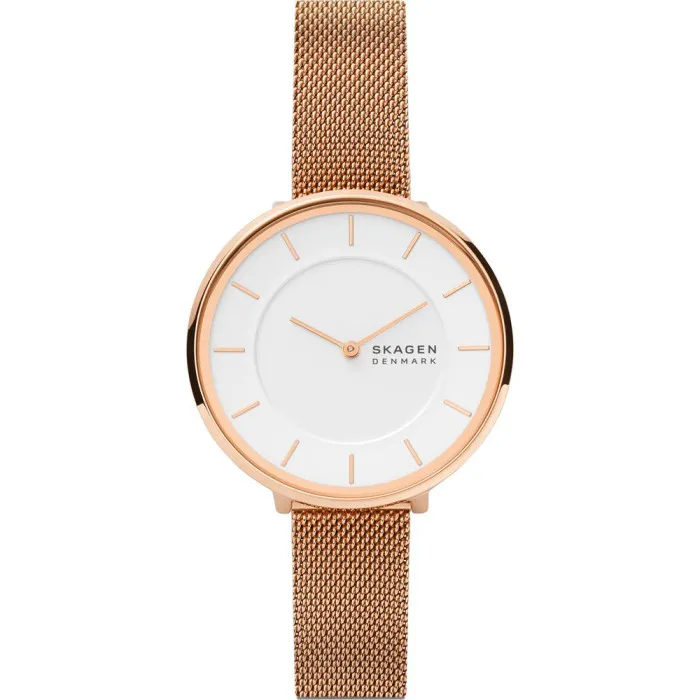 Introducing the Skagen® Analogue 'Gitte' Women's Watch, a stunning blend of elegance and simplicity that embodies the chic, modern aesthetic Skagen is known for. This casual timepiece is designed for women who appreciate a touch of sophistication in their everyday attire. Featuring a round 38mm stainless steel case in a beautiful rose gold hue, it serves as a luminous backdrop for the pristine white dial. The minimalist face is adorned with delicate hour markers, ensuring legibility while enhancing the watch's refined look. The 7mm thickness adds to its delicate appearance, making it a perfect accessory for both formal and casual outfits. Powered by a reliable quartz movement, the Gitte watch guarantees precision and accuracy, essential for today’s busy lifestyle. The mineral glass window provides durability and protection against everyday wear. The watch also boasts a comfortably fitting stainless steel band, measuring 19cm in length and 14mm in width, adorned with the same rose gold finish as the case. The fold-over clasp provides a secure fit, ensuring that you can confidently wear your Gitte watch throughout the day. With an ATM rating of 3 bars, this timepiece can withstand minor splashes, making it not only beautiful but also practical. The Gitte watch is meticulously crafted for women who desire both functionality and style. Whether you're at work, out with friends, or enjoying a lovely evening, let this exquisite watch add a touch of elegance to every moment.Shop Skagen SKW3013 at Ormoda