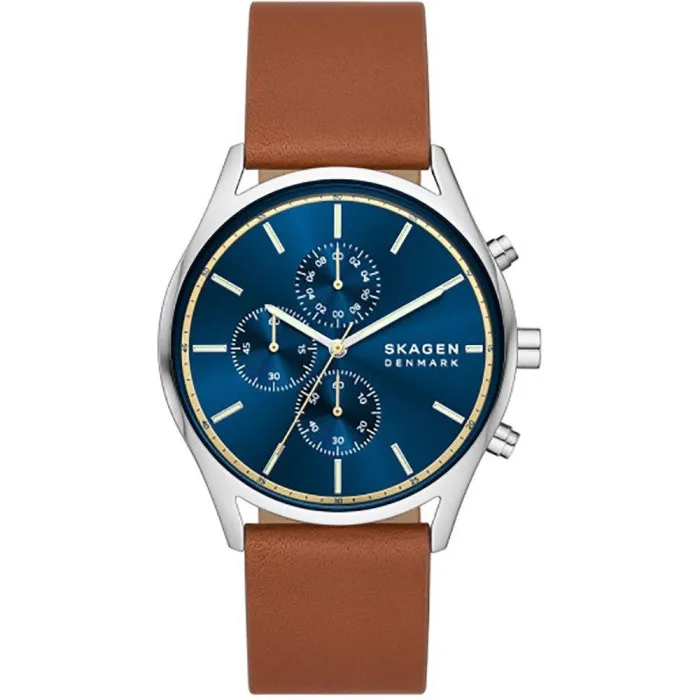 Discover the Skagen® Chronograph 'Holst' Men's Watch SKW6916, a remarkable blend of style and functionality. With a striking blue dial, this watch commands attention while maintaining a casual elegance perfect for any occasion. Crafted with a stainless steel case that measures 42mm in diameter, it showcases sturdy yet sophisticated design principles, featuring a thickness of just 9mm. The mineral glass window offers durability, ensuring your view of the intricate chronograph display remains clear under various conditions. A deep brown leather band, measuring 22mm in width and a comfortable 21cm in length, adds a rich contrast to the watch case, exuding a masculine charm that appeals to discerning tastes. The band includes a reliable buckle clasp, ensuring a secure fit on your wrist. With a water resistance rating of 3 bars, this timepiece can withstand the rigors of everyday life while retaining its impeccable appearance. Weighing in at just 54g, the Skagen Holst feels light on the wrist without compromising on the robust feel of a quality watch. Designed for men who appreciate subtle sophistication and practicality, this chronograph watch stands as a testament to Skagen's commitment to craftsmanship and innovative design. Whether you're dressing up for a business meeting or enjoying a casual day out, the Skagen Holst brings both functionality and charisma to your wrist.