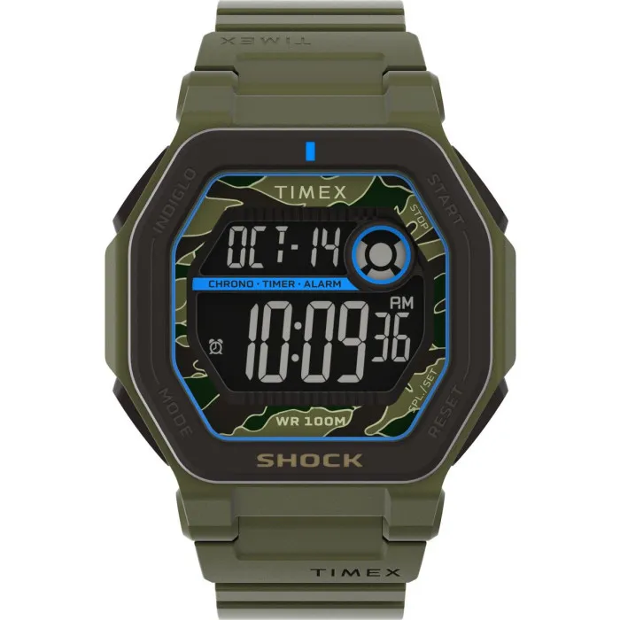 Experience the thrill of adventure with the Timex® Digital 'Command Encounter' Men's Watch TW2V93700, designed for those who live life on the edge. This robust timepiece features a striking rectangular green resin case that measures 45mm in length and 39mm in width, ensuring a bold presence on the wrist. With a thickness of 14mm, it not only looks powerful but is also built to withstand the rigors of your active lifestyle. The vibrant green dial, protected by durable mineral glass, displays essential information clearly, making it perfect for both casual and rugged settings. Enhanced with myriad functions such as a stopwatch, countdown timer, dual time display, alarm, and the reliable Indiglo light feature, this watch is engineered to accompany you on every journey. The comfortable 21cm plastic band extends to fit snugly around the wrist, with a width of 24mm and closed securely with a classic buckle clasp. With an impressive water resistance of up to 10 bars, this watch is ready for whatever adventures you embark on. Gear up with the Command Encounter and let it be the trusted companion that helps you keep track of your time against the backdrop of your adventurous life.Shop Timex TW2V93700 at Ormoda