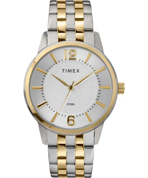 Introducing the Timex® Analogue 'Dress' Men's Watch TW2T59900, a perfect blend of sophistication and durability. Designed for the modern man, this exquisite timepiece boasts a stainless steel case colored in an eye-catching multicolor finish. The round case, measuring 40mm in diameter and 9mm in thickness, offers a robust yet sleek silhouette, ensuring that you make a statement whether at a formal event or simply enjoying a night out. The silver dial features a mineral glass window for optimal clarity, presenting an elegant backdrop for the analogue display that distinctly showcases the time with precision.