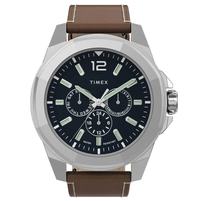 Discover the Timex® Multi Dial 'Essex Avenue' Men's Watch TW2U42800, a quintessential accessory designed for those who appreciate sophistication and functionality. This striking timepiece features a well-balanced blue dial adorned with luminous hands and numbers, ensuring readability even in low-light conditions. The quartz movement guarantees precise timekeeping, while the round stainless steel case, measuring 46mm in diameter and 12mm in thickness, exudes durability and style. With a water resistance of up to 5 bars, this watch is perfect for casual outings or more adventurous activities. The watch's multi-dial display adds to its character, showcasing the day-date function prominently. A reliable Indiglo light feature empowers you to view the time in the dark, making this accessory as practical as it is stylish. The brown leather band, extending to 21cm in length and 21mm in width, offers comfort and a touch of sophistication while featuring a classic buckle clasp. Whether you're dressing for a day at the office or a casual weekend outing, the Timex Multi Dial 'Essex Avenue' delivers a perfect balance of form and function. It stands as a testament to Timex's commitment to quality and design, making it an essential addition to any modern man's watch collection. Shop Timex TW2U42800 at Ormoda