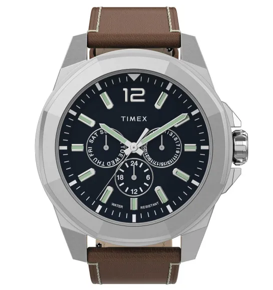 Discover the Timex® Multi Dial 'Essex Avenue' Men's Watch TW2U42800, a quintessential accessory designed for those who appreciate sophistication and functionality. This striking timepiece features a well-balanced blue dial adorned with luminous hands and numbers, ensuring readability even in low-light conditions. The quartz movement guarantees precise timekeeping, while the round stainless steel case, measuring 46mm in diameter and 12mm in thickness, exudes durability and style. With a water resistance of up to 5 bars, this watch is perfect for casual outings or more adventurous activities. The watch's multi-dial display adds to its character, showcasing the day-date function prominently. A reliable Indiglo light feature empowers you to view the time in the dark, making this accessory as practical as it is stylish. The brown leather band, extending to 21cm in length and 21mm in width, offers comfort and a touch of sophistication while featuring a classic buckle clasp. Whether you're dressing for a day at the office or a casual weekend outing, the Timex Multi Dial 'Essex Avenue' delivers a perfect balance of form and function. It stands as a testament to Timex's commitment to quality and design, making it an essential addition to any modern man's watch collection.