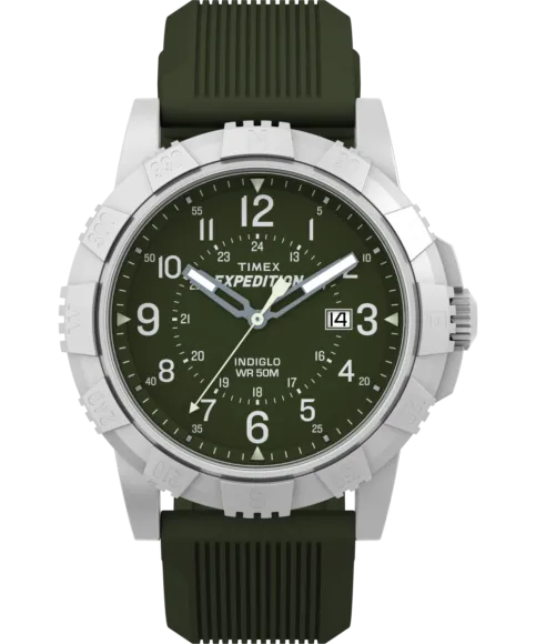 Introducing the Timex® Analogue 'Expedition North Ridge' Men's Watch TW4B32100, a timepiece that perfectly embodies the spirit of adventure. Representing the renowned Timex brand, this watch is designed for those who seek exploration, durability, and reliable performance. Timex has been a pioneer in watchmaking since its inception, known for creating timepieces that withstand the rigors of outdoor activities while maintaining modern style and functionality. With a commitment to quality and craftsmanship, Timex embodies the ethos of exploring the uncharted and embracing life's journeys. Crafted for men who appreciate both form and function, the Expedition North Ridge stands out with its striking green dial, housed within a sturdy silver brass case that measures 45mm in diameter. The watch is designed to be versatile, suitable for both casual wear and rugged adventures. Its quartz movement guarantees precise timekeeping, ensuring you're always on schedule whether in the boardroom or on the trail. The striking green silicone band not only adds a touch of flair but also ensures comfortable wear, measuring 21cm in length and 22mm in width. This durable band secures with a traditional buckle, assuring you that it will stay in place, no matter where your adventures take you. With a thickness of 13mm, this watch sits comfortably on the wrist, while its robust design, rated at 5 ATM, can handle everyday splashes and brief immersions in water. To keep you informed, the watch features a handy date calendar, perfectly merging practicality with style. The mineral glass dial window withstands scratches while enhancing readability, making it an essential companion for the modern man. The Expedition North Ridge is more than just a watch; it is a statement piece that reflects your active lifestyle and sophisticated taste.Shop Timex TW4B32100 at Ormoda