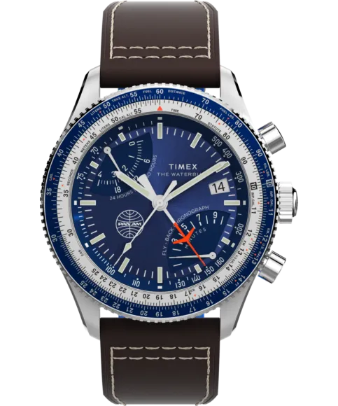 Timex® Chronograph 'Fly Back X Pan Am' Men's Watch TW2W97200 is not just a timepiece, but a narrative of adventure and style. This watch, embraced by the sophisticated masculine appeal, comes adorned with a striking blue dial that captures the essence of exploration. The watch's round stainless steel case measures 43mm in diameter, offering a robust build while weighing a mere 90 grams, ensuring comfort on your wrist. Its sleek mineral glass protects the face from everyday wear and tear, while the turnable bezel adds a functional yet stylish touch, making this watch perfect for both casual and formal settings. The watch features a tasteful brown leather band that complements its overall aesthetic with a length of 21cm and a width of 21mm. The buckle clasp ensures a secure fit, allowing the wearer to focus on their day without worry. The chronograph display provides added functionality, enabling precise timekeeping for all your adventures. A date function enhances practicality, making it ideal for the modern man who thrives on efficiency. With an impressive water resistance of up to 10 bars, this timepiece caters to a variety of activities—whether it's a business meeting or an afternoon swim. Designed for the confident individual who enjoys quality craftsmanship, the Timex® Chronograph is as much about functionality as it is about making a statement. It's a perfect companion for those who appreciate a blend of heritage and innovation, perfectly suited to meet the demands of today’s adventurous lifestyle.Shop Timex TW2W97200 at Ormoda
