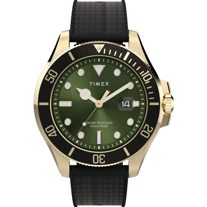 Introducing the Timex® Analogue 'Harborside Coast' Men's Watch TW2Y05300, a perfect blend of style and functionality designed for the modern man. This exceptional timepiece features a sophisticated green dial that stands out against its striking gold case, crafted from durable brass. With a case diameter of 43mm and a thickness of just 11mm, it's designed to make a bold statement while remaining comfortable on the wrist. The turnable bezel adds an element of utility, allowing for versatile use, whether you're navigating the seas or simply enhancing your style. The watch showcases a high-quality quartz movement that ensures precision and reliability, making it an ideal companion for daily wear or special occasions. The black rubber band not only offers exceptional comfort but also guarantees durability, measuring 21cm in length and 20mm in width. This watch is equipped with a buckle clasp for secure fastening, ensuring it stays put through any activity. Moreover, the mineral glass dial window provides clarity and protection, further enhancing the watch's longevity. With a water resistance of up to 10 bars, the Timex 'Harborside Coast' can withstand various environments, from rain to splashes during your aquatic adventures. It's not just about telling time; it's about doing so with confidence and style. This watch also includes a convenient date calendar feature, ensuring you stay on track in both your professional and personal life.Shop Timex TW2Y05300 at Ormoda