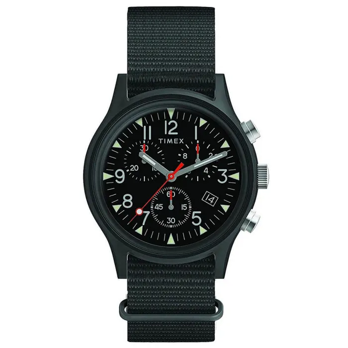 Step into timeless style with the Timex® Chronograph 'Mk1 Chrono' Men's Watch TW2R67700. This military-inspired timepiece celebrates a blend of functionality and rugged elegance—perfect for the modern man. Its sleek black aluminum case, measuring 40mm in diameter, boasts a durable charm with a thickness of 13mm. The black dial, protected by mineral glass, provides an unobstructed view of the classic timekeeping and chronograph features. With a sturdy yet lightweight design, this watch weighs only 40 grams, making it comfortable for daily wear. The Mk1 Chrono features a precise quartz movement that ensures accuracy while embracing a straightforward aesthetic. The adjustable black fabric band, radiating a tough yet refined character, perfectly complements its robust design and fits comfortably on wrists measuring up to 21cm. With a band width of 20mm and a secure buckle clasp, it offers both stability and ease of use. Being water-resistant up to 3 bars, it stands ready to accompany you on any adventure, whether you're out in nature or at the office. One of the great features of this timepiece is its functionality—the chronograph display allows you to track time with precision, while the date calendar ensures you stay organized. The watch lug to lug height of 46mm provides a suitable fit for various wrist sizes, affirming that this watch is designed to meet the needs of contemporary men who value both style and practicality. Shop Timex TW2R67700 at Ormoda
