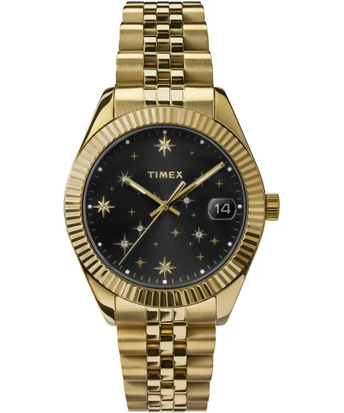 Introducing the exquisite Timex® Analogue 'Traditional' Women's Watch TW2W21700, an elegant timepiece designed for the modern woman who appreciates both style and functionality. This dress watch features a stunning gold stainless steel case with a sophisticated 34mm diameter. The round case design, complemented by a sleek 10mm thickness, ensures a perfect fit for any wrist. The captivating black dial, protected by durable mineral glass, is adorned with a refined date calendar feature, making it both practical and stylish. The gold stainless steel band, extending to a generous 19cm, offers comfort and elegance in equal measure. With a width of 15mm, the band is designed to seamlessly complement the watch's case, creating a harmonious look that can transition effortlessly from day to evening wear. A fold-over clasp with a push-button mechanism provides secure closure, ensuring that this beautiful watch stays safely in place as you go about your day. Timex is renowned for its commitment to quality and precision, and the quartz movement in this watch reflects that heritage. With an impressive water resistance of up to 5 bars, this timepiece is perfect for daily wear, adding a touch of class to your outfit without compromising on durability. Weighing in at just 82.0 grams, it sits comfortably on your wrist, making it an ideal companion for both special occasions and everyday elegance. Experience the charm of this timeless piece that embodies the perfect blend of tradition and modernity, elevating your accessory collection with sophistication and grace.