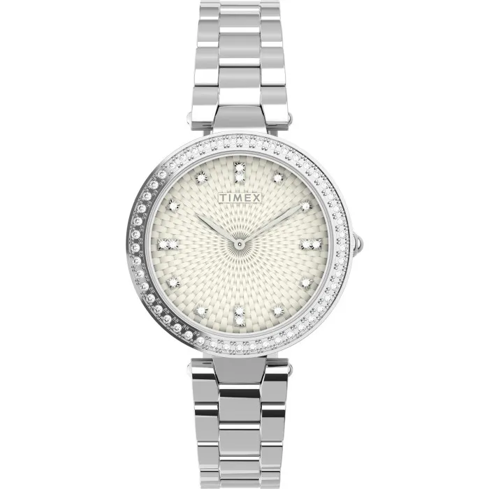 The Timex® Analogue 'Trend' Women's Watch TW2V45000 exemplifies elegance through its refined design and acclaimed craftsmanship. This stunning timepiece embodies the stylish sophistication that Timex is celebrated for, bringing a beautiful balance to any outfit whether it's for a casual day out or a formal evening. The watch features a striking round brass case measuring 32mm in diameter and only 7mm thick, making it a lightweight and comfortable accessory for daily wear. With its classic silver case color, it boasts a subtle yet impactful presence on the wrist. The white mineral glass dial serves as a canvas for precision movement, showcasing easily legible hour markers and hands that glide in a smooth, analogue fashion. The eye-catching stone settings on the bezel add a touch of luxurious glamour, highlighting the intricate details that are characteristic of Timex watches. Complementing the watch’s elegant case is a durable stainless steel band, finished in a radiant silver hue and measuring 19cm in length. Its 13mm width, paired with a fold-over clasp with push buttons, ensures a secure yet stylish fit. Designed to withstand daily wear, this exquisite timepiece is water-resistant up to 5 bars, making it suitable for light splashes and rain. Whether you are dressing for a special occasion or looking to elevate your everyday style, the Timex® Analogue 'Trend' Women's Watch is an essential addition to your jewelry collection. With a total weight of only 72 grams, it is lightweight enough to keep on all day effortlessly, truly embodying grace and functionality in every tick of its reliable quartz movement.Shop Timex TW2V45000 at Ormoda